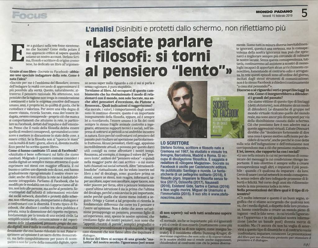 “Lasciate parlare i filosofi, si torni al pensiero lento”, intervista su Mondo Padano, 15 febbraio 2019.