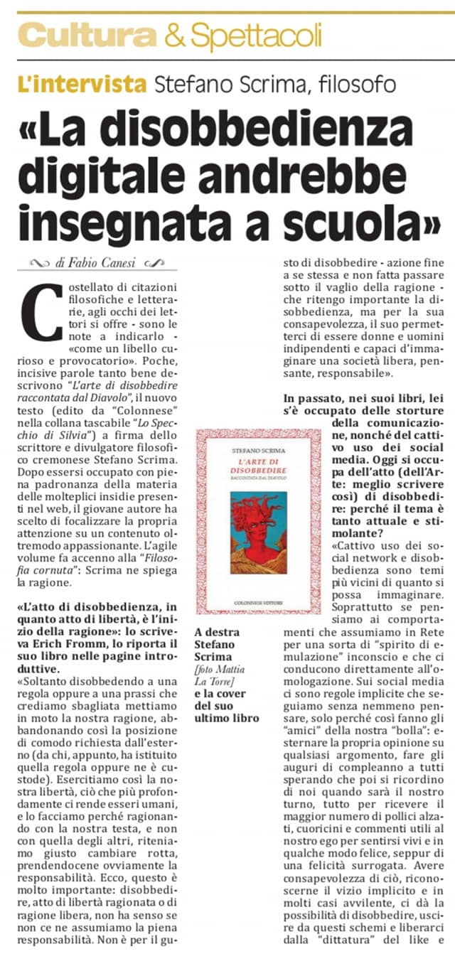 “Lucifero è portatore di luce e conoscenza” di Federico Pani, Il Piccolo di Cremona,